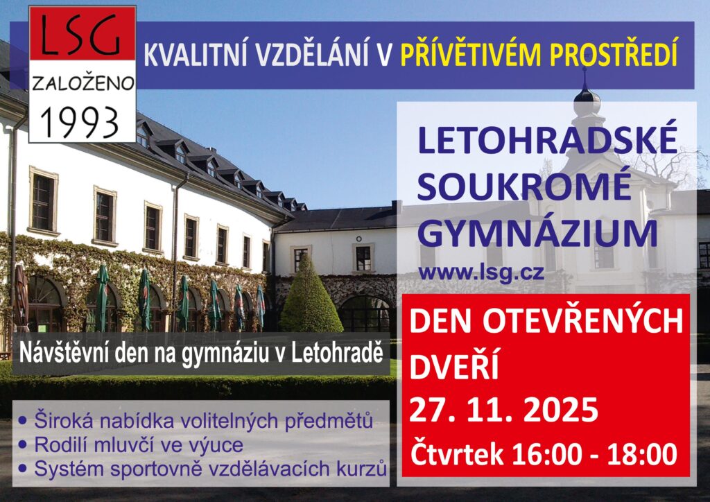 Budeme potěšeni, přijdete-li se podívat na moderní gymnázium v příjemném prostředí letohradského zámku. Provázet vás budou naši současní studenti a budete mít tedy příležitost z nich o škole „vytáhnout“ vskutku vše, co budete chtít vědět. K dispozici vám samozřejmě bude vedení školy a kantoři.