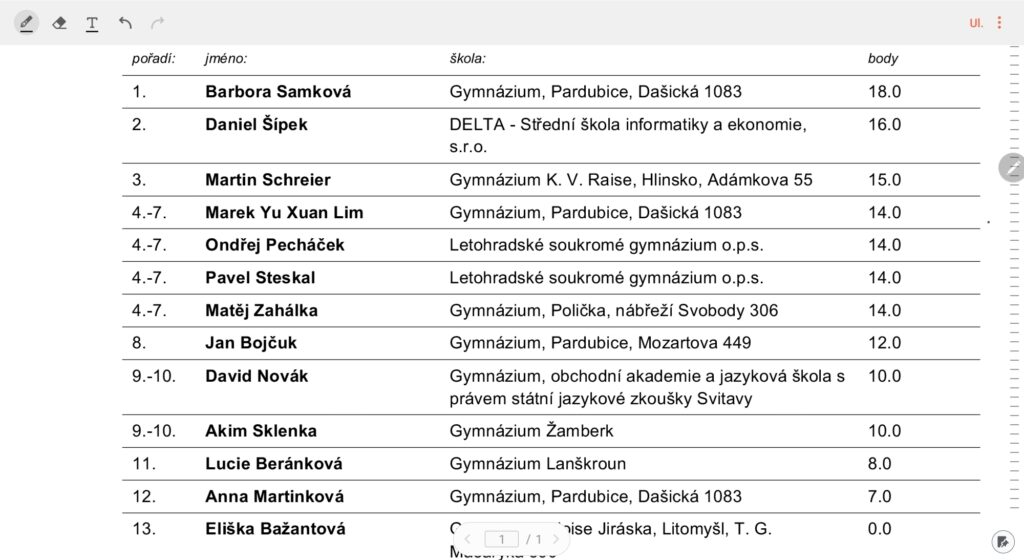 Sextáni LSG Ondra Pecháček a Pavel Stejskal odvedli v krajském kole matematické olympiády velmi dobrou práci a umístili se na sdíleném 4. místě, pouhý 1 bod od místa třetího. A to ve velmi obtížné konkurenci téměř výhradně gymnázií Pardubického kraje.