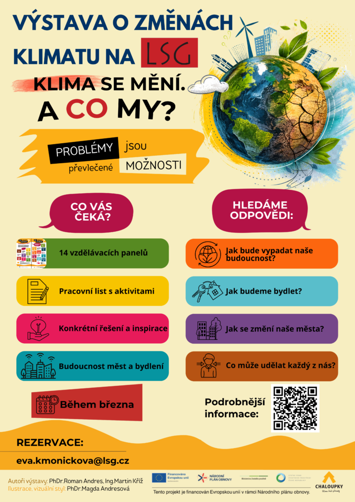 Výstava „Klima a náš měnící se svět“Aktuality / Napsal Eva Kmoníčková / 4. 3. 2026 Zveme Vás na výstavu o klimatu v prostorách LSG. K vidění jsou interaktivní panely vzdělávacího obsahu: Jak bude vypadat naše budoucnost? Jak budeme bydlet? …. Klima se mění a co naše škola? Klima a emoce, Svět příznivý pro všechny, Změna klimatu probíhá v Česku, Problémy jsou převlečené možnosti a další. Výstava potrvá do konce března. K dispozici je 14 panelů a pracovní list plný činností pro žáky. Zájemce prosíme o domluvu na e-mailu eva.kmonickova@lsg.cz.